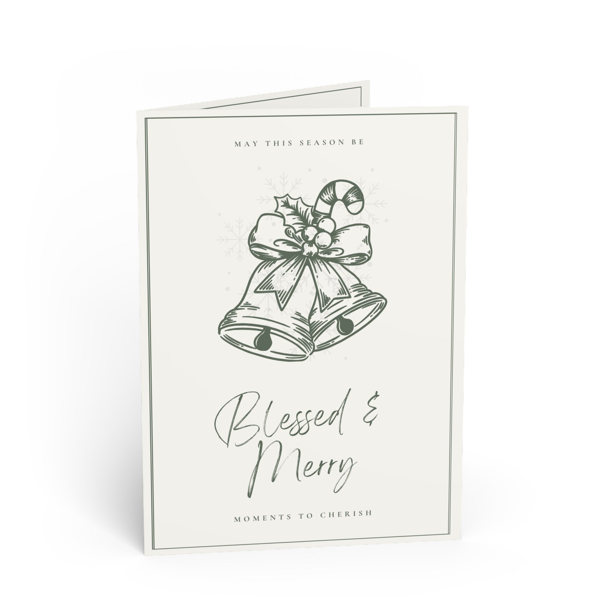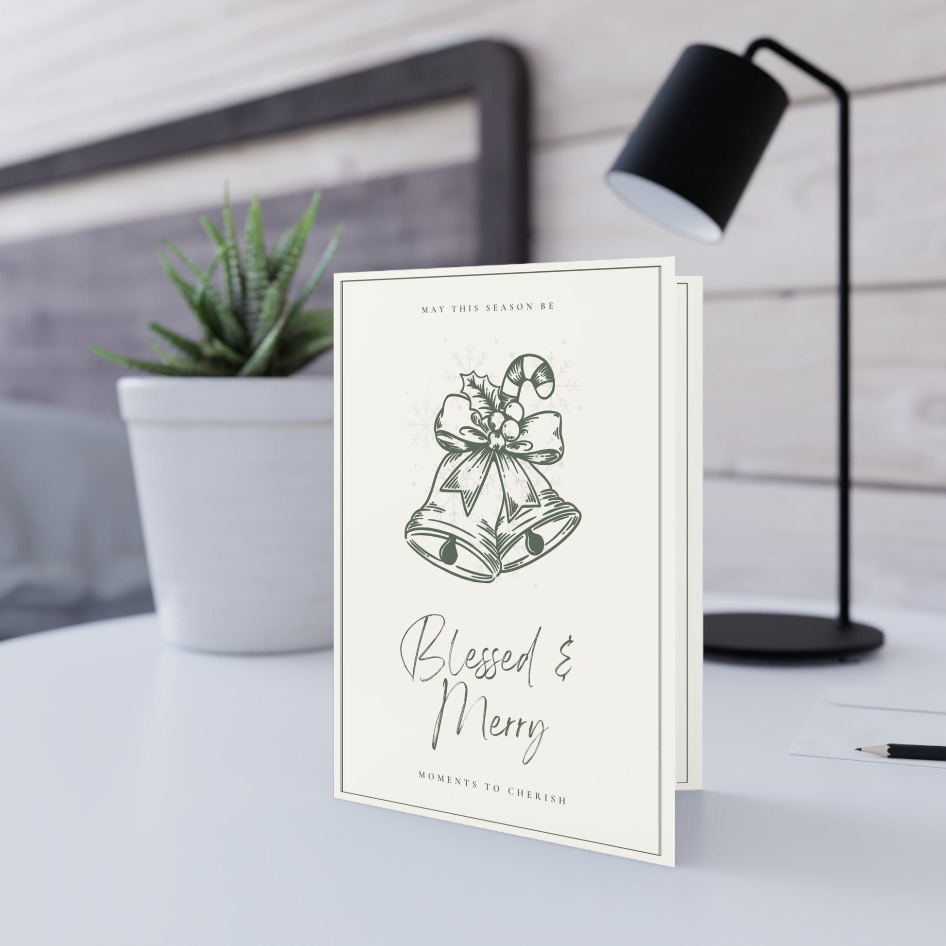 A quiet, heartfelt holiday card that feels like a small blessing in the mailbox. The front shows a hand-drawn pair of bells, a candy cane, and a simple bow rendered in soft, muted tones with delicate border details. The message reads “Blessed & Merry,” leaving plenty of room inside for a personal note. It’s made to be held and savored — a calming, sincere way to share warmth, faith, and holiday wishes with family, church friends, or anyone who values understated seasonal sentiment.